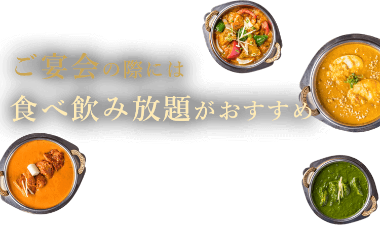 「あれもこれも食べたい!」ご宴会や女子会の際の、そんなご要望にも全力でお応えいたします。当店ではお越しいただいた皆様に、存分に楽しんでいただけるよう、食べ飲み放題をご用意。人気のチーズナンやタンドリーチキンもお好きなだけご注文いただけます。思いっきり食べて飲んで、楽しいひと時をお過ごしください。